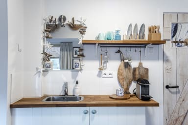 Wir haben Platz für 2 Gäste in einem Doppelbett. Es gibt 1 privates Badezimmer mit einer begehbaren Dusche, ein Sofa, eine kleine Essecke und eine Kochnische mit kleinem Kühlschrank und Kaffee (Nespresso)/Tee-Einrichtung.