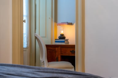 The main bedroom was stunning, with a striking plaster ceiling, three doors with shutters, each with a tiny balcony fro which you can look down on the street. There is a small work area with a desk.