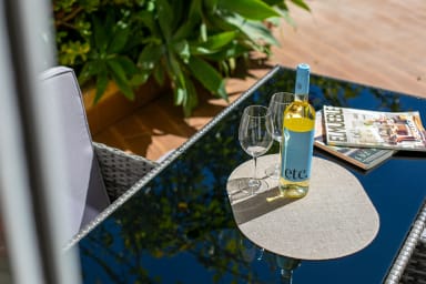 Draußen kannst du deine teilweise private Terrasse genießen, ideal für einen Morgenkaffee oder ein entspanntes Abendgetränk.