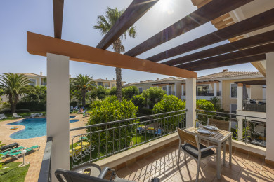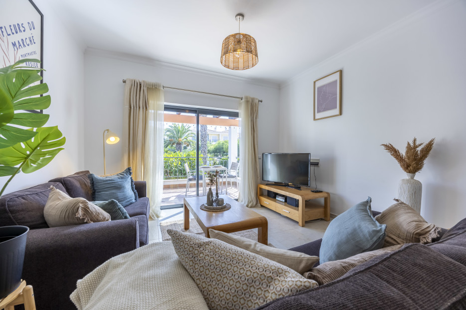 As you enter the apartment, you’re greeted by a spacious living and dining area, bathed in natural light. Double-glazed patio doors open to a generous terrace, offering picturesque views of the lush gardens and sparkling swimming pool—an ideal spot for enjoying the warm Algarvian sunshine.