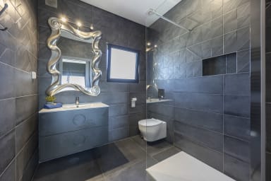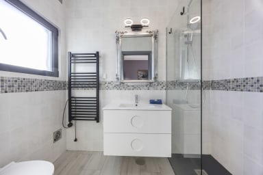 The shared south-facing garden offers a 12 x 5 meter pool with steps and a constant depth of 1.60 m, shared with the guests of the annex at the back of the garden. Guests of the apartment have their own designated terrace area near the villa, with a BBQ, covered seating, and a large table, as well as two sun loungers and a hammock. Additional loungers, a dining set, and a poolside toilet and shower are also available for shared use.