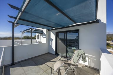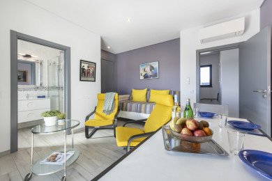 From here, you can access both the bedroom and the living space. The bedroom features a comfortable double bed, an en-suite bathroom, air conditioning, and direct access to a small south-facing roof-terrace. The bright living and dining area includes a dining table and a sofa bed, making the apartment suitable for up to three guests. At the back of this space, there is a second bathroom. The living area also opens onto a south-facing roof-terrace with open views over the valley and towards the ocean, while the north side of the property faces the mountains.