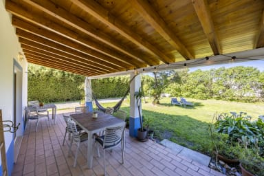 The house itself is spacious and welcoming, designed for relaxed days and easy living. As you step inside, you enter a large living area that invites you to slow down, read a book, share meals, and enjoy time together without distractions. There is no television, encouraging a true break from daily routines. The house has excellent insulation, which keeps it naturally cool during the summer months, so air conditioning is not needed.