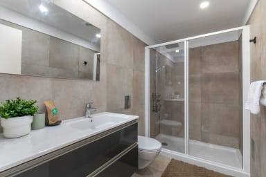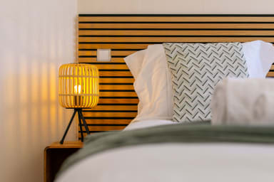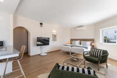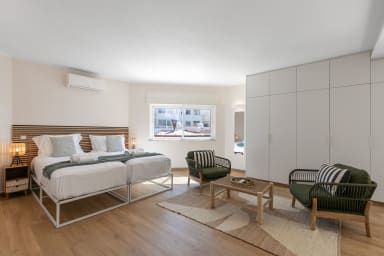 Dit lichte studio-appartement biedt een gastvrije retreat, op slechts een paar minuten van het centrum van Lagos. De open ruimte bevat een kingsize bed gemaakt van twee losse matrassen (90×200 cm, ~30 cm hoog), een volledig uitgeruste open keuken en een privé badkamer met douche.