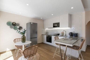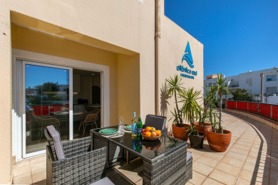 Vanuit de woonkamer stap je het terras op, dat binnenkort verdeeld zal worden zodat één gedeelte gemeenschappelijk blijft, terwijl jouw deel exclusief privé wordt, toegankelijk via schuifdeuren. Het is de perfecte plek om te ontspannen na een dag op het strand.
